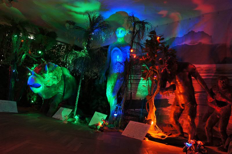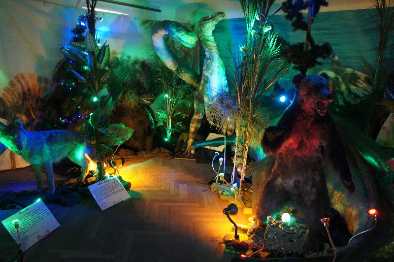Фигуры освещены цветной подсветкой, придающей достоверность и загадочность образам. Интерьер выставки оформлен интерьерными баннерами и маскировочной сеткой, что дает возможность посетителям перенестись в мир древнего леса.